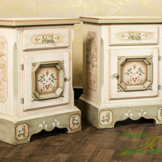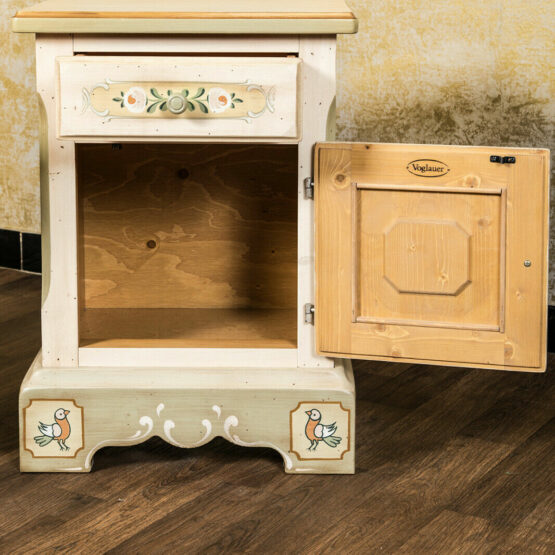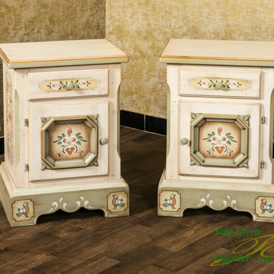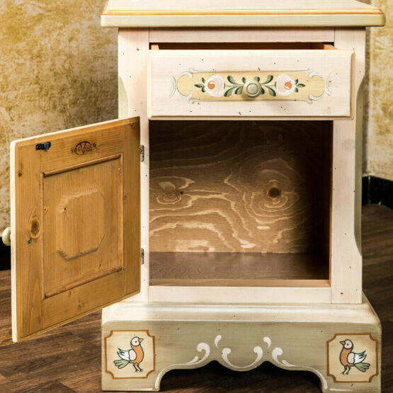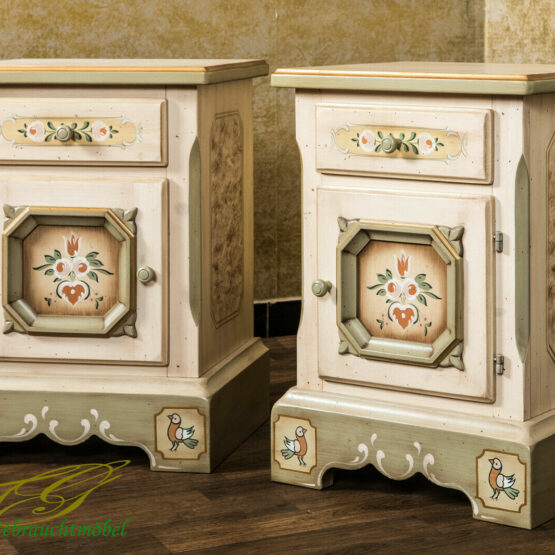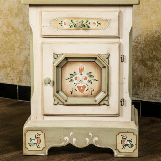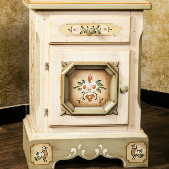 Die kunstvolle Bauernmalerei auf dem schlichten Altweiß verleiht dem Nachttisch eine verspielte Eleganz und macht ihn zu einem besonderen Blickfang in jedem Schlafzimmer.