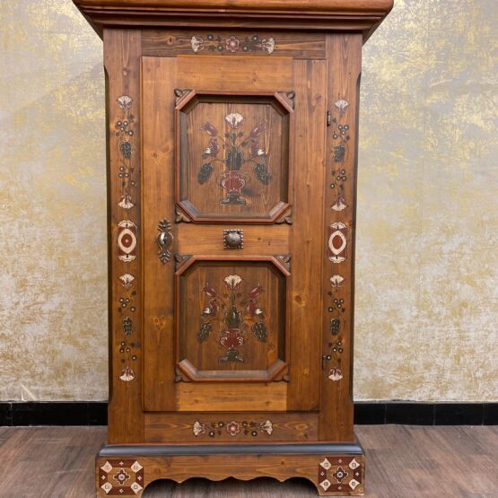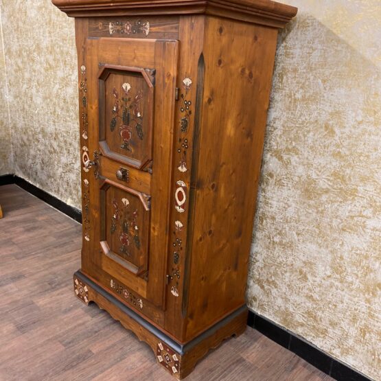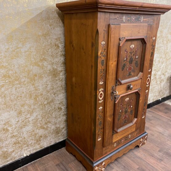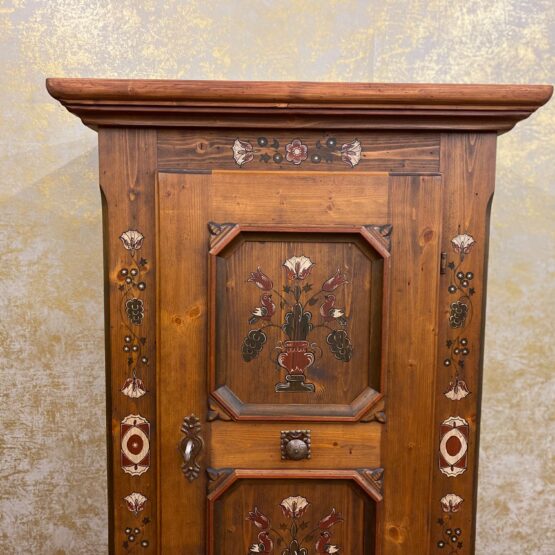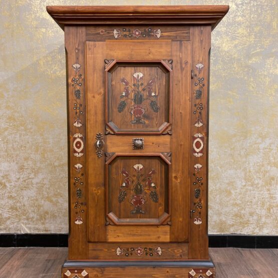 Die beiden markant gerahmten Türfelder zeigen zarte Blumensträuße in traditioneller Farbgebung – ein Blickfang, der Handwerkskunst und Heimatgefühl vereint. Im Inneren bietet der Schrank praktischen Stauraum für Geschirr, Tischwäsche oder Alltagsgegenstände.