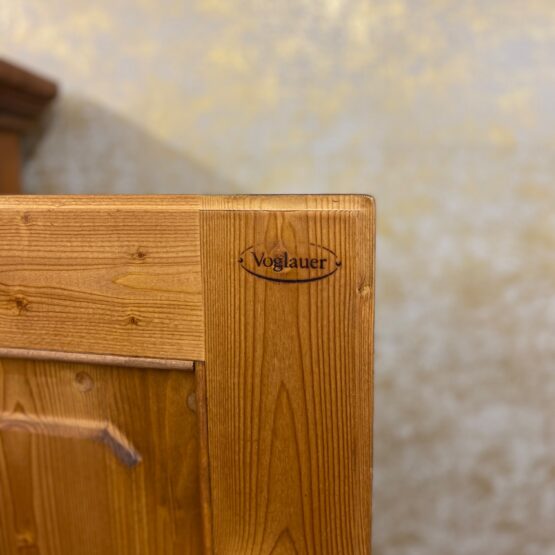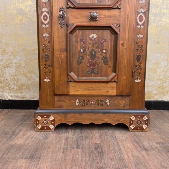 Dieser charmante Schrank aus der Serie „Anno 1700“ begeistert mit seiner warmen, braun gebeizten Oberfläche und der kunstvollen Bauernmalerei.