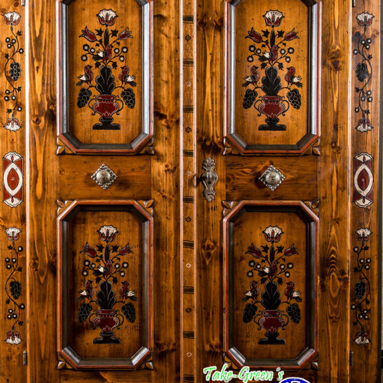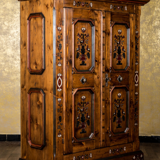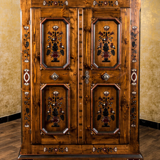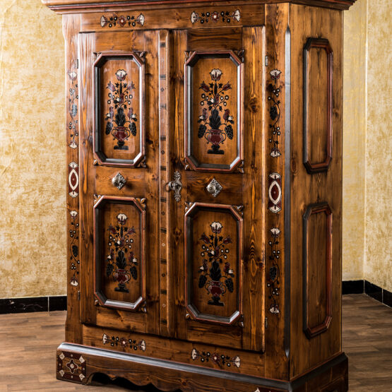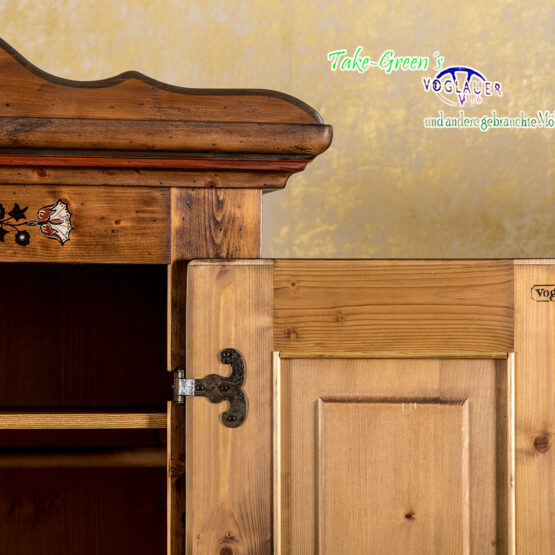 Dieser braun gebeizte Voglauer Schrank bringt das warme Flair traditioneller Bauernstuben in Ihr Zuhause. Mit aufwendiger Floralmalerei in satten Rottönen und tiefem Schwarz, verströmt das Möbelstück eine erdige Eleganz, die Wurzeln und Wertigkeit ausstrahlt.