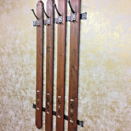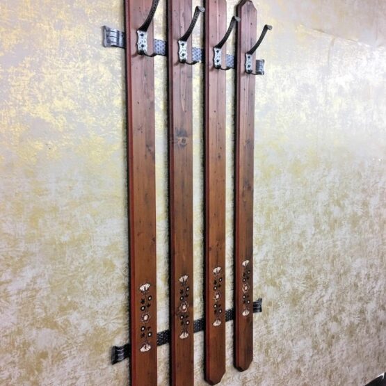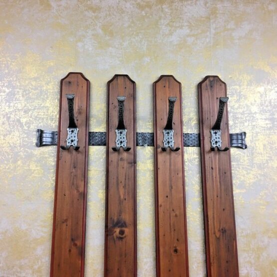 Schwarze Schmiedeeisen-Haken setzen einen markanten Kontrast und bieten Platz für Jacken, Taschen und Hüte. Ob im Eingangsbereich oder in der Stube – diese Garderobe bringt Ordnung mit Charakter.