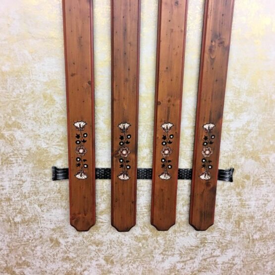 Die vier senkrechten Holzleisten in warmem Antikbraun wurden von Hand restauriert und liebevoll mit floralen Elementen bemalt – ein feines Detail, das jedem Flur einen Hauch ländlicher Wohnkultur verleiht.