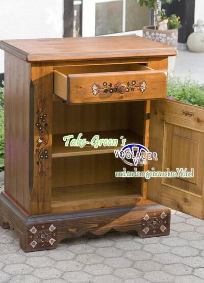 Florale Malereien auf der Tür und Schublade erzählen vom Können traditioneller Maler und verleihen dem Möbelstück einen Hauch von Heimatgefühl. Der gezackte Sockel mit Intarsienmotiven und die dezenten Gebrauchsspuren unterstreichen die Echtheit und Geschichte dieses Unikats.