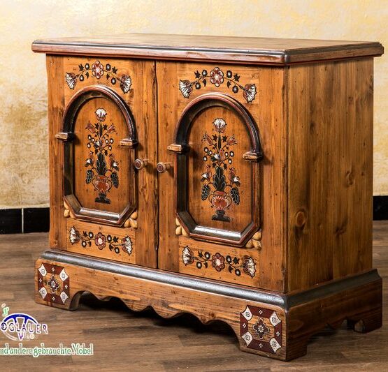 Das warme Antikbraun des Holzes bringt Tiefe und Natürlichkeit in jeden Raum, während die handbemalten Blumenmotive auf den Türen mit liebevollen Details Geschichten aus längst vergangenen Zeiten erzählen. Zwei verzierte Flügeltüren öffnen sich zu einem großzügigen Innenraum mit drei praktischen Fächern – ideal für alles, was stilvoll und griffbereit verstaut werden soll.