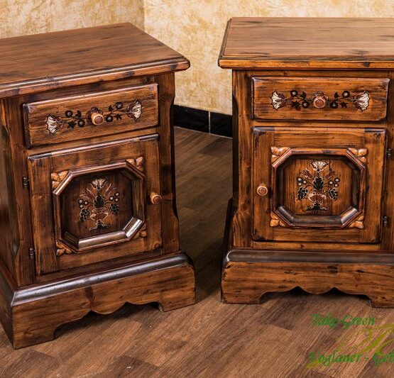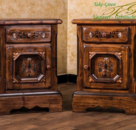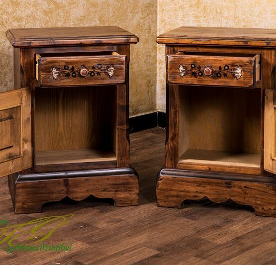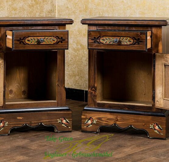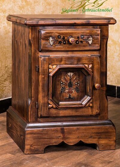 Dieser sorgfältig restaurierte Nachttisch aus Fichte, handbemalt und in Antik-Optik, stammt aus dem traditionsreichen Hause “Voglauer”.