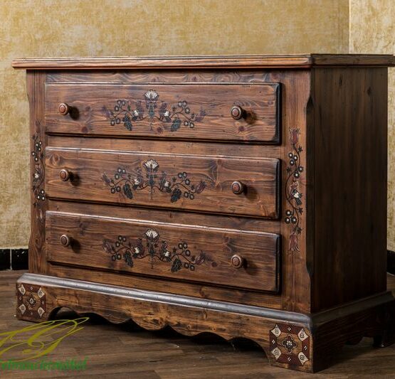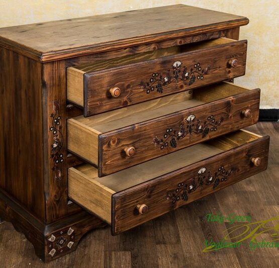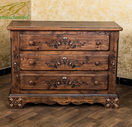 Liebevoll handverziert, ist diese Kommode nicht nur praktisch, sondern auch ein Ausdruck zeitloser Handwerkskunst.