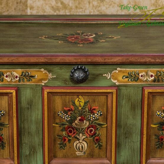 Gefertigt aus massivem Fichtenholz und von Hand bemalt, entsteht ein harmonisches Gesamtbild, das ländliche Wärme und traditionellen Charme in Ihr Zuhause bringt.