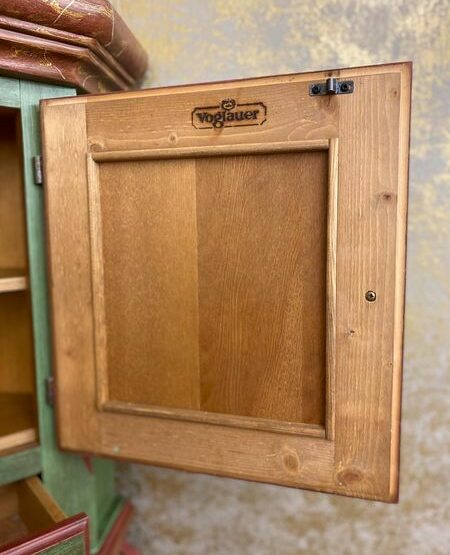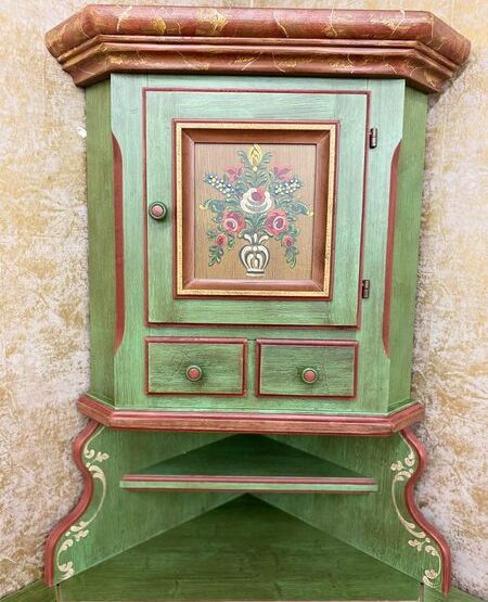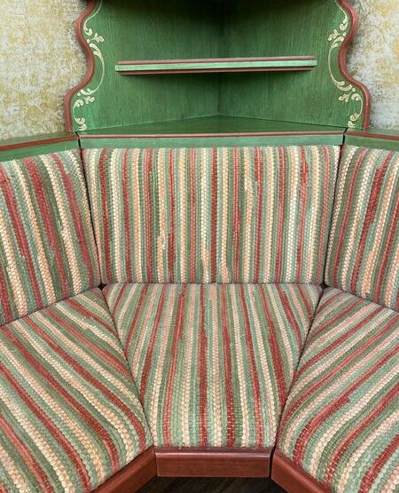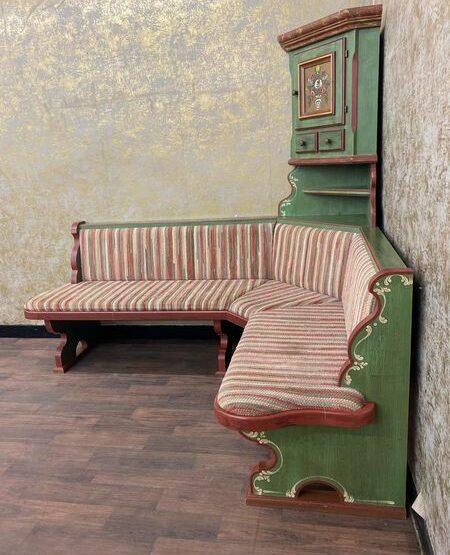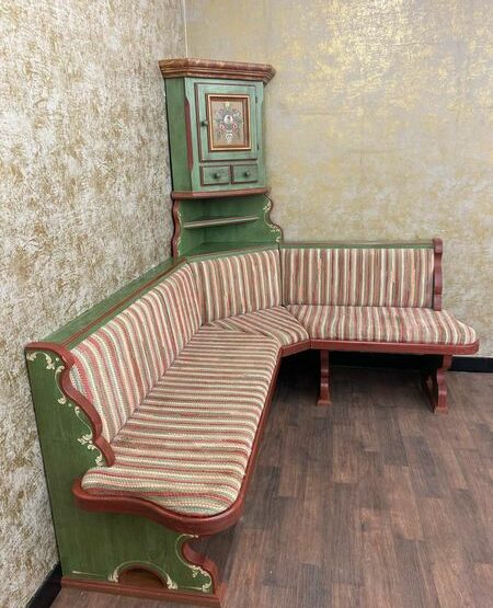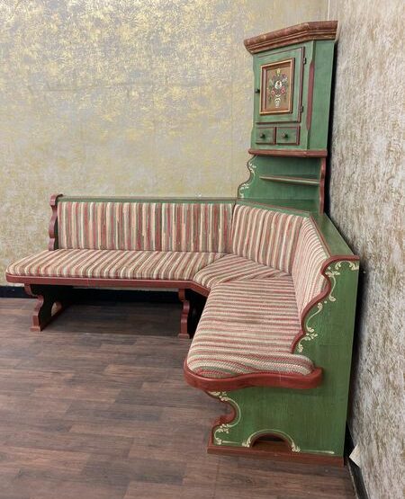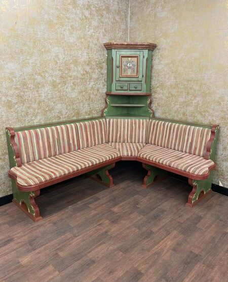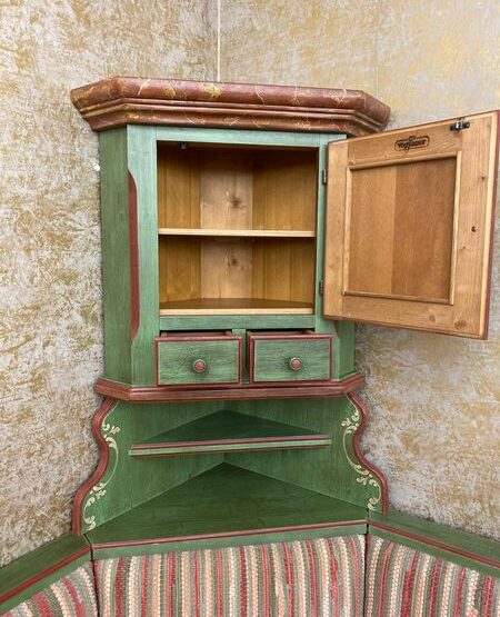 Es handelt sich bei dieser äußerst gemütlichen Essgarnitur im Landhausstil, die aus Eckbank mit integriertem Eckschrank besteht, um sehr exquisite Stücke von höchster Qualität.