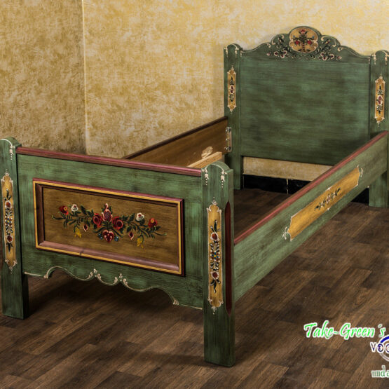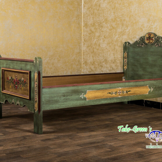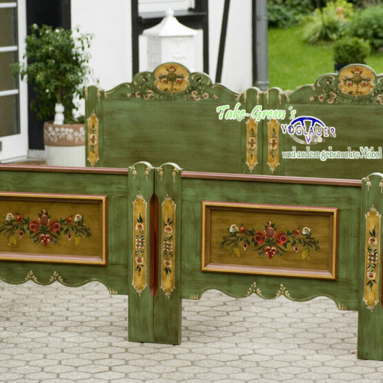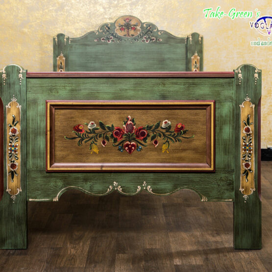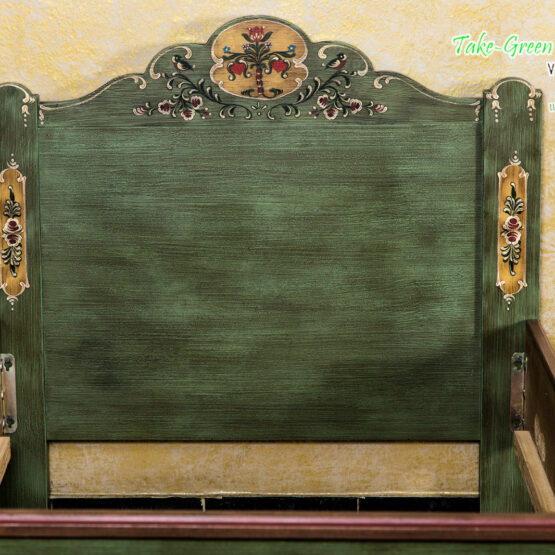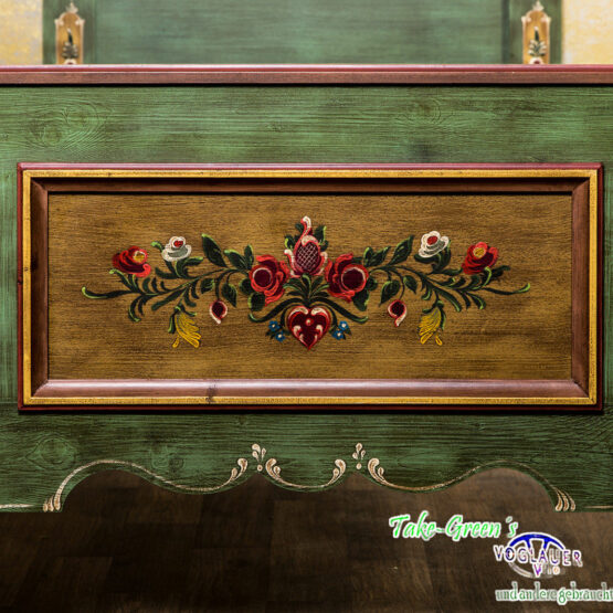 Gefertigt aus massivem Fichtenholz und von Hand bemalt, überzeugt es mit detailreichen Blumenmotiven und kunstvollen Verzierungen in edlem Altgrün.