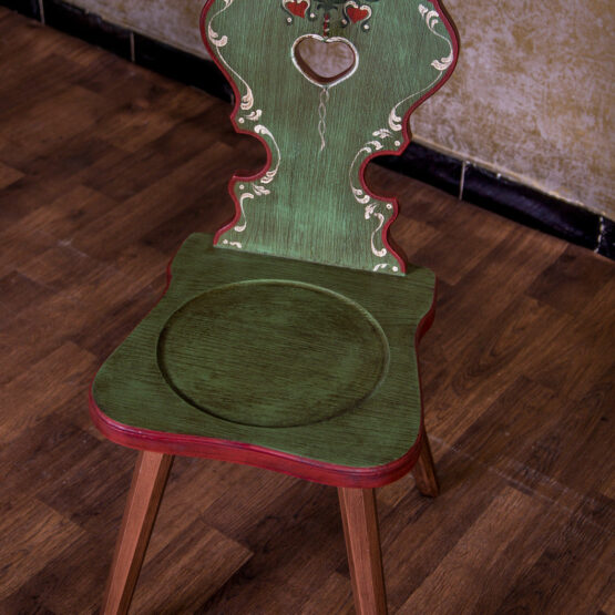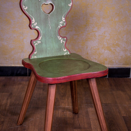 Dieser charmante Holzstuhl aus der Serie „Anno 1800“ von Voglauer verbindet traditionelle Handwerkskunst mit alpinem Flair.
