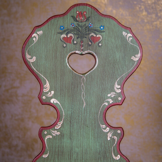 Besonders ins Auge fällt die kunstvoll gearbeitete Rückenlehne mit dem typischen Herz-Ausschnitt, der dem Stuhl eine verspielte Note verleiht. Dank der stabilen Bauweise eignet er sich ideal als Esszimmerstuhl oder als dekoratives Einzelstück im Wohn- oder Schlafzimmer.