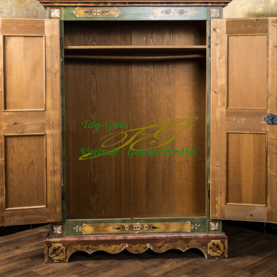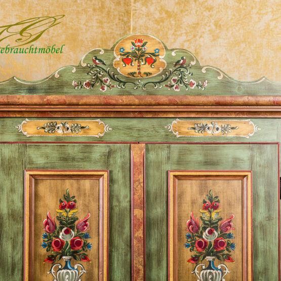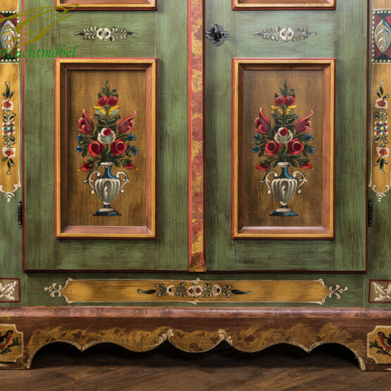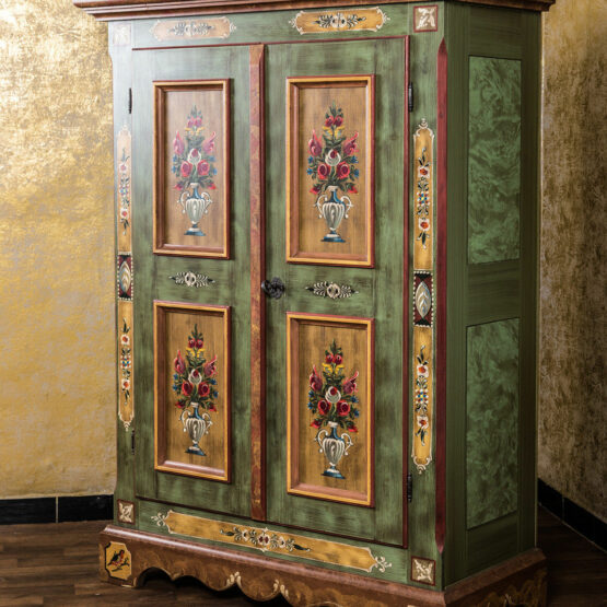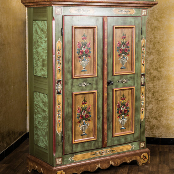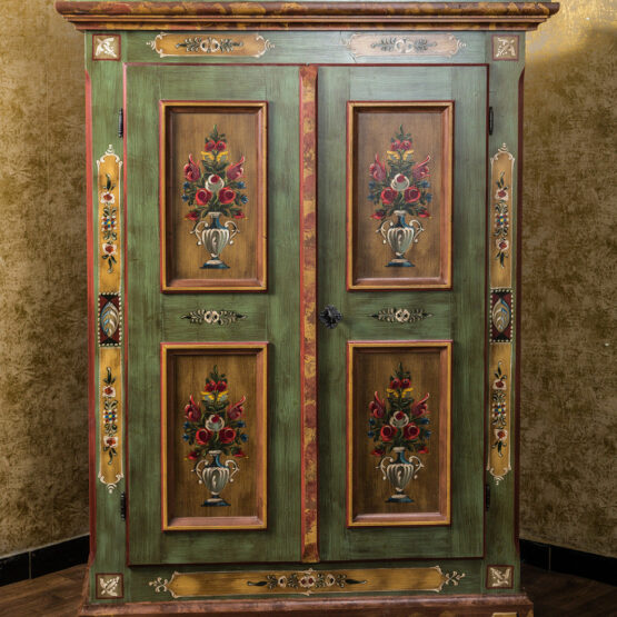 Die harmonische Kombination aus Altgrün, warmen Holztönen und farbenfrohen Verzierungen macht den Kleiderschrank zu einem echten Blickfang, der jedem Raum eine elegante Landhausnote verleiht. Ein Möbelstück, das sowohl durch Funktionalität als auch durch seine unverwechselbare Ausstrahlung begeistert.