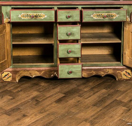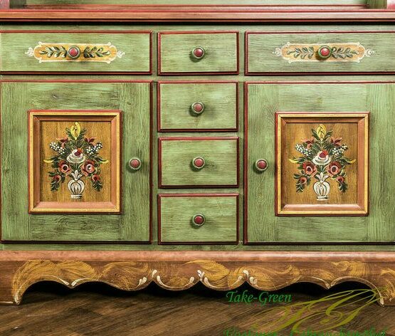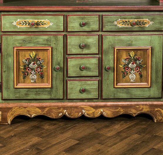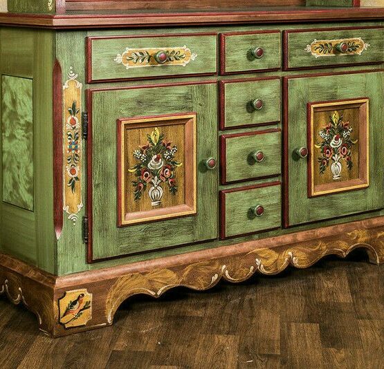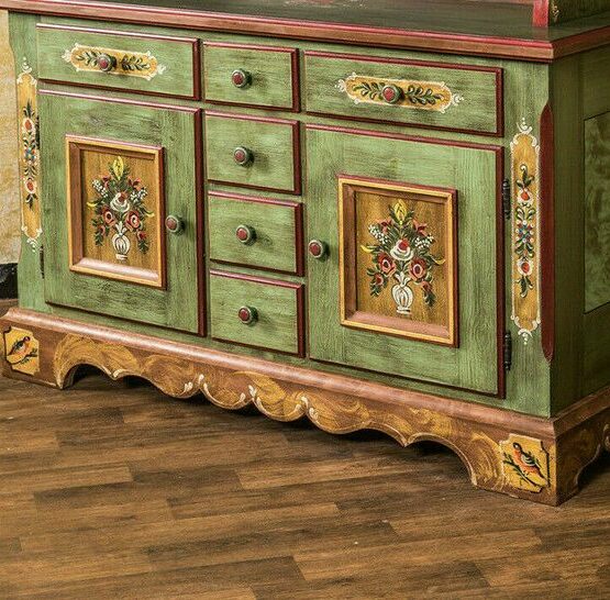 Die altgrün gefassten Fronten mit traditionellen Blumen- und Rankenmalereien setzen farbliche Akzente, während der rötlich abgesetzte Rahmen die Formen kunstvoll betont. Fünf Schubladen und zwei geräumige Türen bieten reichlich Platz für Tischwäsche, Alltagsgegenstände oder Liebgewonnenes – praktisch, ohne auf Ästhetik zu verzichten.