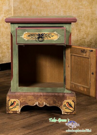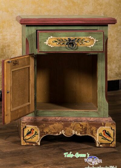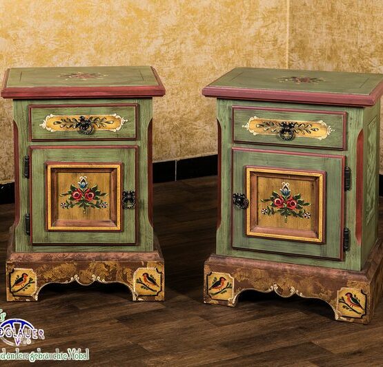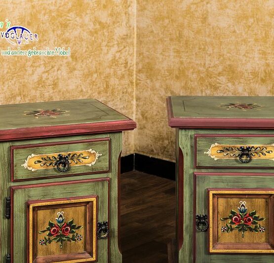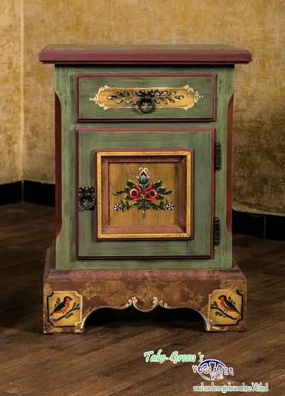 Wie gemacht für ruhige Nächte und liebevolle Details: Dieser originale Voglauer-Nachttisch aus der Anno-1800-Serie bringt mit seinem altgrünen Korpus, der rötlich abgesetzten Platte und der floralen Bemalung einen Hauch von alpiner Romantik ans Bett.