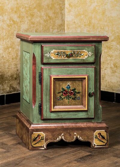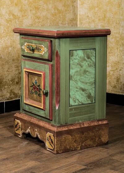Das altgrüne Möbelstück mit warmen Rot- und Goldakzenten ist mehr als nur ein Aufbewahrungsort – es ist ein Statement für ländliche Wohnkultur. Die zierlich bemalte Tür mit Rechtsanschlag und die darüberliegende Schublade bieten Platz für persönliche Dinge, während die geschnitzte Sockelverzierung mit kleinen Vögelchen für einen Hauch verspielter Nostalgie sorgt.