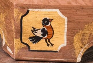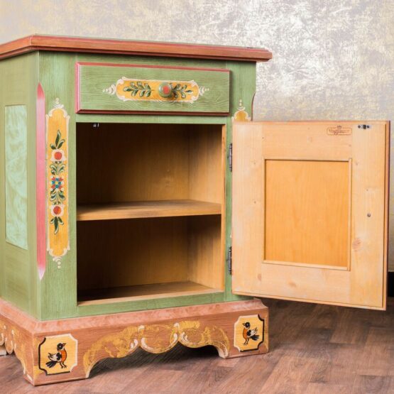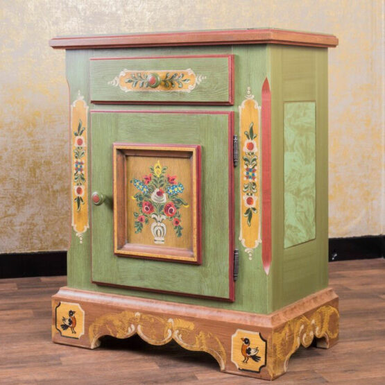 Gefertigt aus massivem Fichtenholz und in einem warmen Altgrün bemalt, beeindruckt es durch die detailreichen Handmalereien und die farblichen Akzente. Hinter der Tür verbirgt sich ein Einlegeboden, der den Innenraum in zwei praktische Fächer unterteilt. Darüber befindet sich eine Schublade, die zusätzlichen Stauraum für kleinere Dinge bietet.