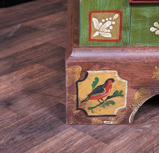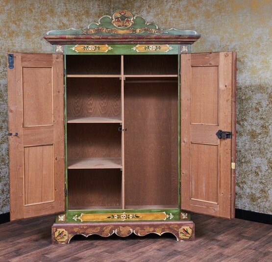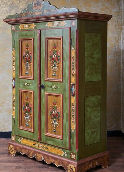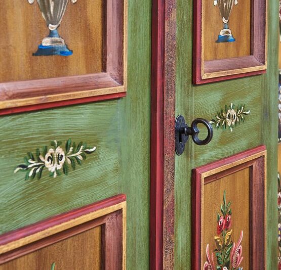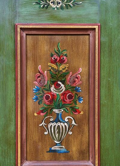 In lebendigem Altgrün gehalten, mit meisterhaft von Hand bemalten Blumenbouquets, strahlt er Wärme, Kunstfertigkeit und Geschichte aus. Die Doppeltür öffnet den Blick auf eine durchdachte Inneneinteilung mit Fächern und Kleiderstange – perfekt für Kleidung, Wäsche oder Tischdecken.