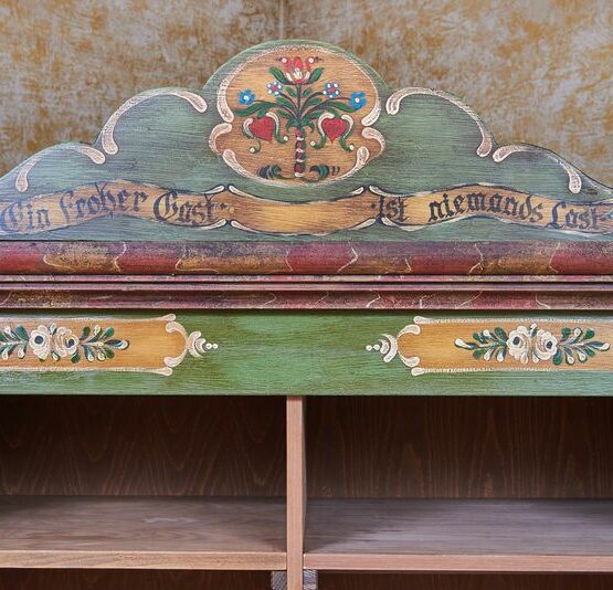 Die charmante Wellenkrone mit floraler Schnitzerei rundet das Gesamtbild ab. Dieses Möbelstück bringt nicht nur Ordnung, sondern auch ein Stück gelebte Heimat in Ihr Zuhause.