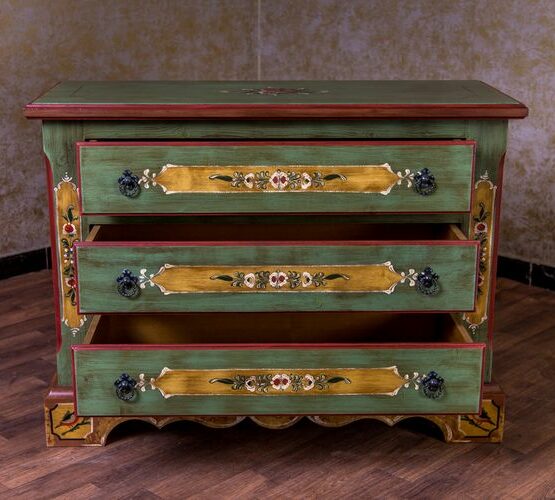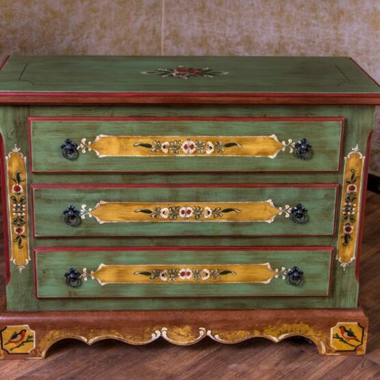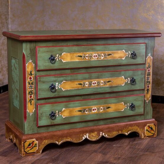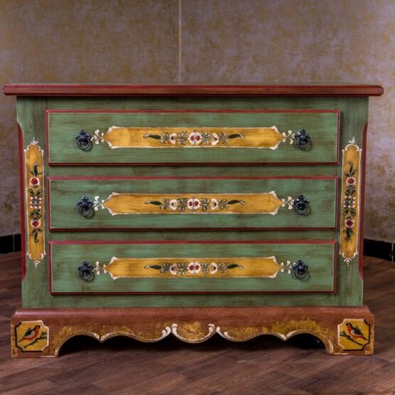 Gefertigt aus massivem Holz und liebevoll von Hand bemalt, besitzt sie jene Ausstrahlung, die Wohnräume nicht nur schmückt, sondern prägt. Drei gleich große Schubladen bieten großzügigen Stauraum für Alltägliches und Liebgewonnenes.
