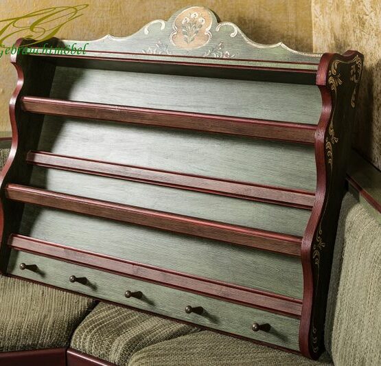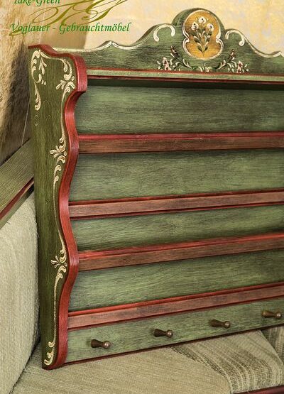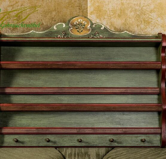 In traditionellem Altgrün von Hand bemalt, zeigt es florale Motive und feine Details, die jedem Raum Wärme und Authentizität verleihen. Drei Ablageleisten bieten Platz für Zierteller, Kochbücher oder Erinnerungsstücke – ein Schmuckstück für Küche, Stube oder Essbereich.