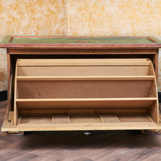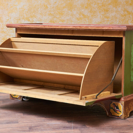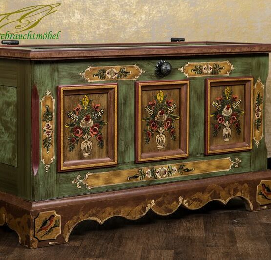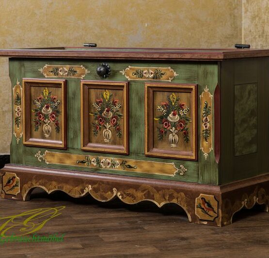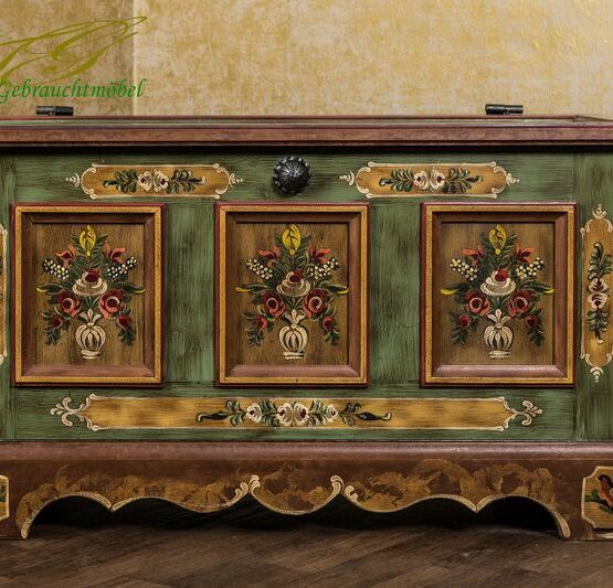 Das massive Möbelstück besticht durch seine detailreiche Bauernmalerei in harmonischem Altgrün mit warmen Rot- und Goldtönen. Die floralen Verzierungen und geschwungenen Sockelleisten verleihen der Truhe eine elegante, alpine Ausstrahlung.