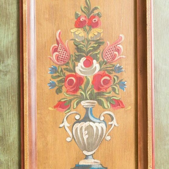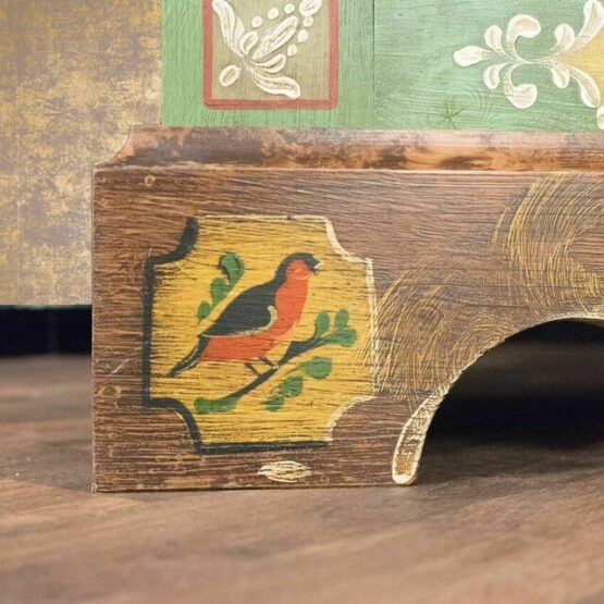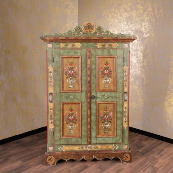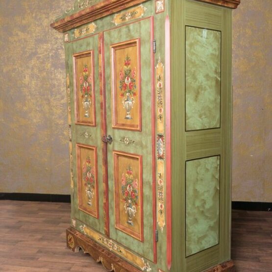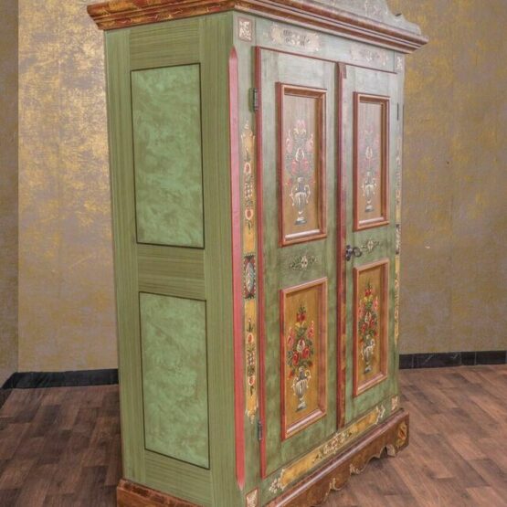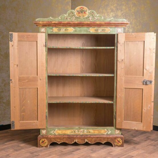 Besonders das geschwungene Kranzprofil mit floralem Motiv setzt einen kunstvollen Akzent, während die Ziermalereien an Sockel und Kanten seine handwerkliche Qualität unterstreichen. Im Inneren bietet der Schrank mit seinen stabilen Einlegeböden großzügigen Stauraum für Kleidung, Wäsche oder Geschirr.
