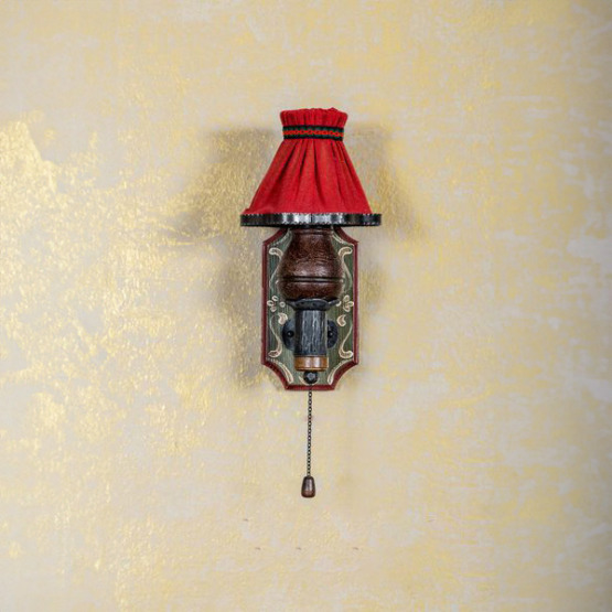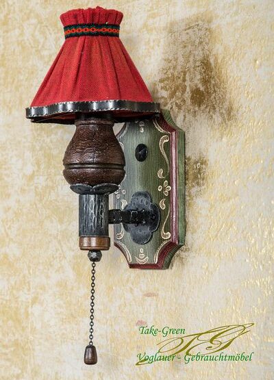 Der handbemalte Holzsockel im typischen Altgrün trägt eine kleine Leuchte mit Zugschalter, gekrönt von einem feuerroten Textilschirm. Das warme Licht, das sie ausstrahlt, erinnert an Abende in alten Stuben, an Geschichten, die man sich am Kachelofen erzählt.