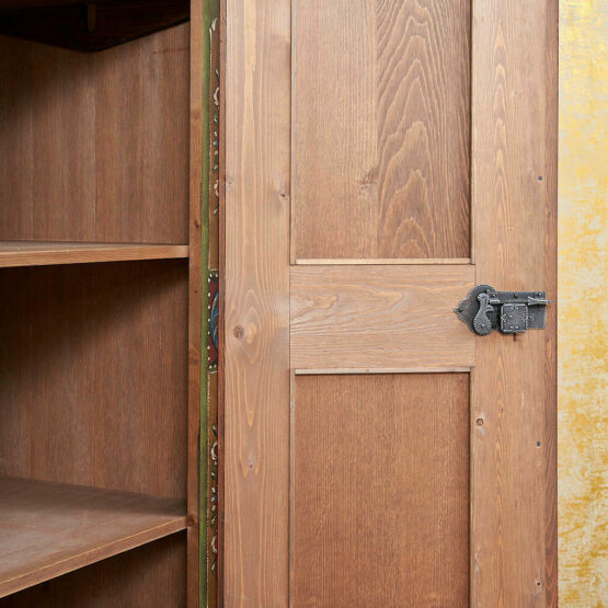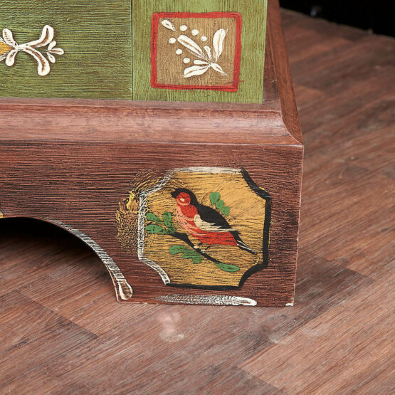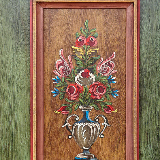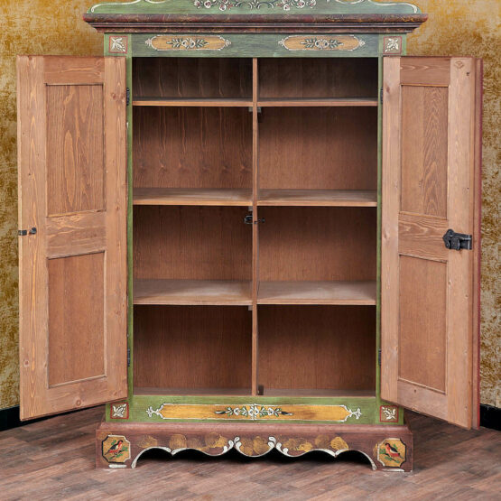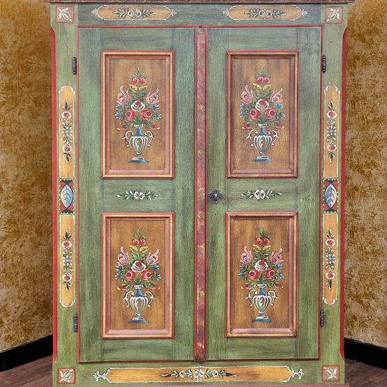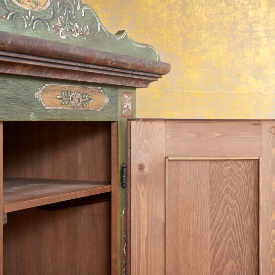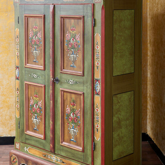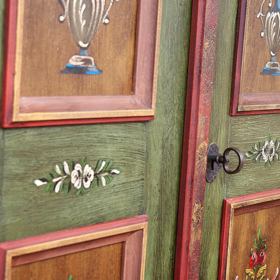 Die Türen sind aufwendig mit floralen Motiven verziert, die in liebevoller Handarbeit entstanden sind. Das Zusammenspiel von Altgrün, warmen Holz- und Rottönen sowie goldfarbenen Akzenten verleiht dem Schrank seine besondere Ausstrahlung.