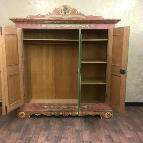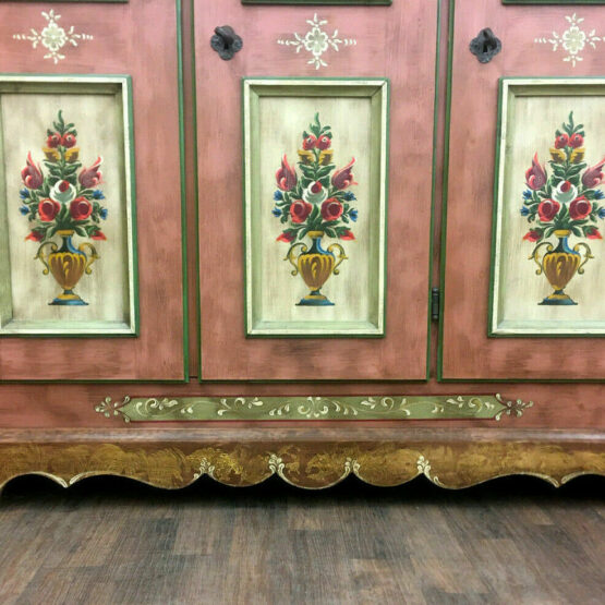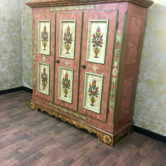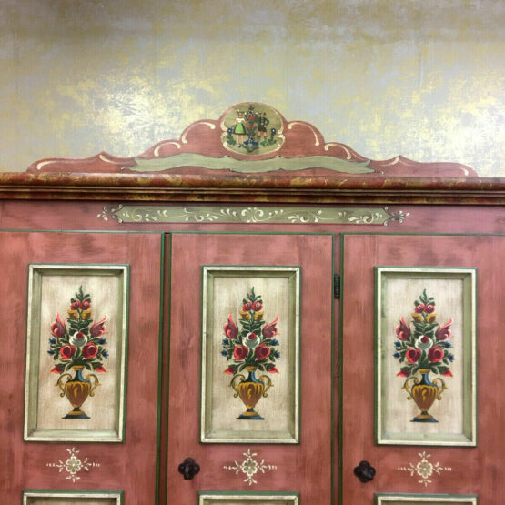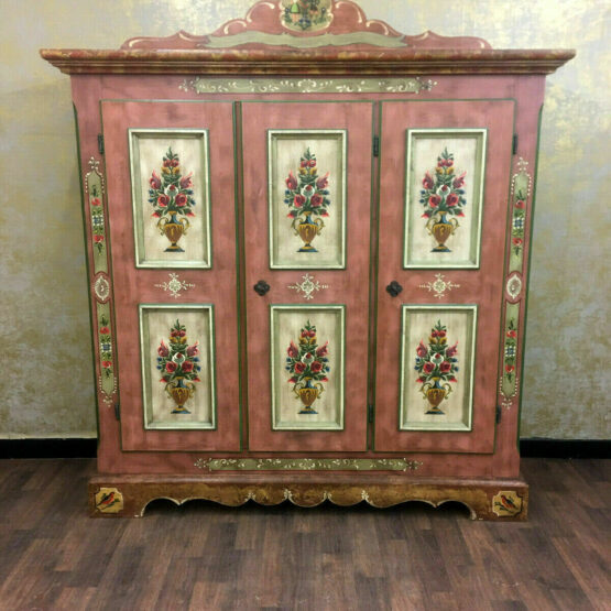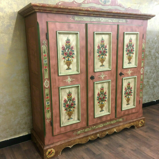 Ein eindrucksvoller Bauernschrank aus der Serie “Anno 1800”, der durch seine warme Farbgebung in Altrosa und die kunstvolle Handbemalung besticht. Liebevoll ausgearbeitete Blumenmotive und feine Details verleihen diesem Möbelstück seinen unverwechselbaren Charakter.