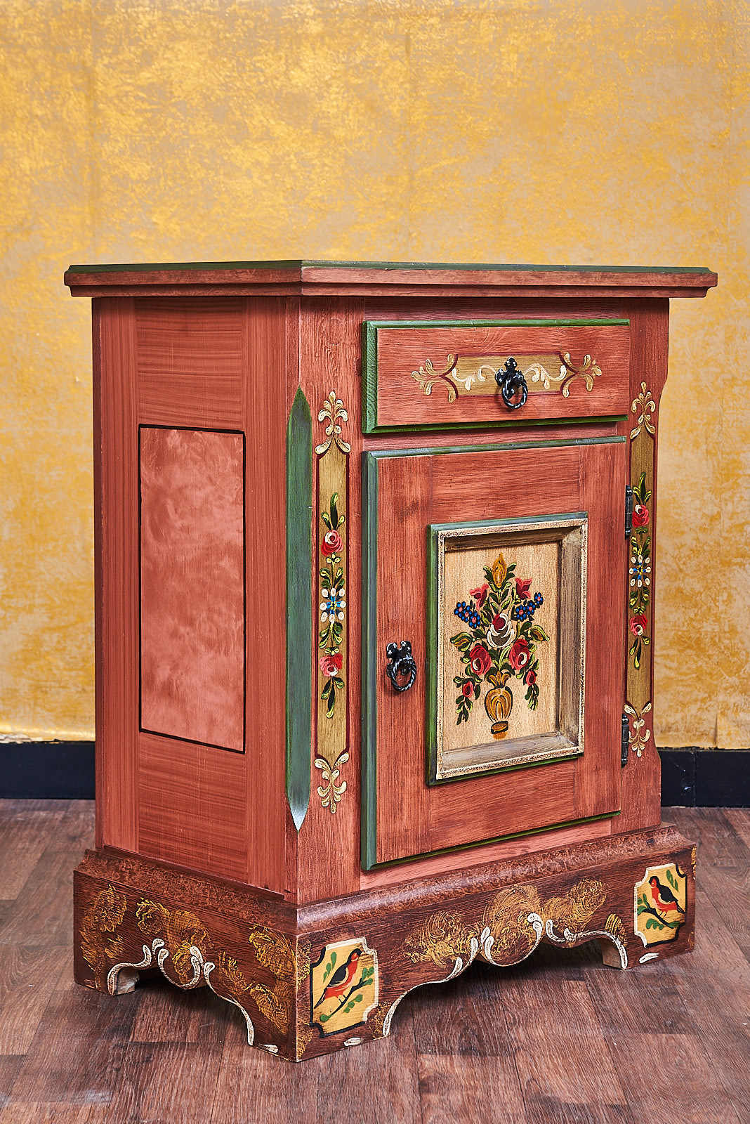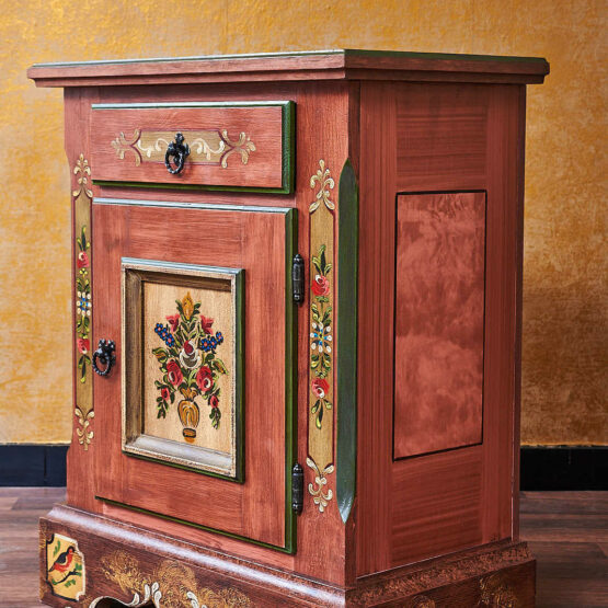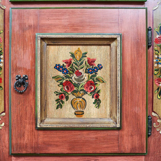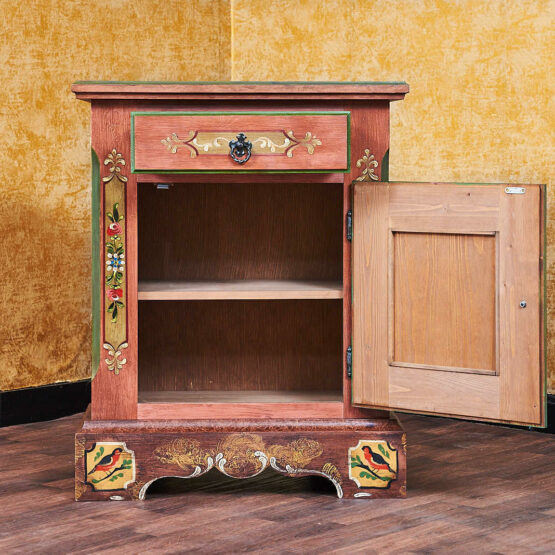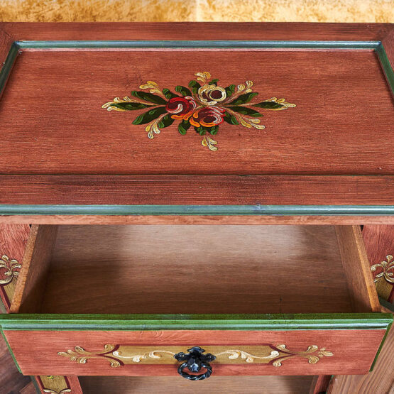 Besonders eindrucksvoll ist die aufwendige Bemalung mit floralen Motiven, die dieser Kommode ihre unverwechselbare Ausstrahlung verleiht. Die harmonische Farbgebung in warmem Altrosa mit grünen Akzenten sorgt dafür, dass das Möbelstück nicht nur praktisch, sondern auch ein echter Blickfang in Ihrem Zuhause ist.