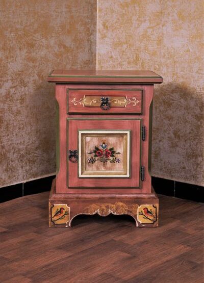 Dieser liebevoll gestaltete Nachttisch von Voglauer bringt den Zauber alpenländischer Wohnkultur in Ihr Schlafzimmer. Das altrosa lackierte Massivholz wurde mit kunstvollen Blumenmotiven und zarten Zierleisten von Hand bemalt – jedes Stück ist ein Unikat.