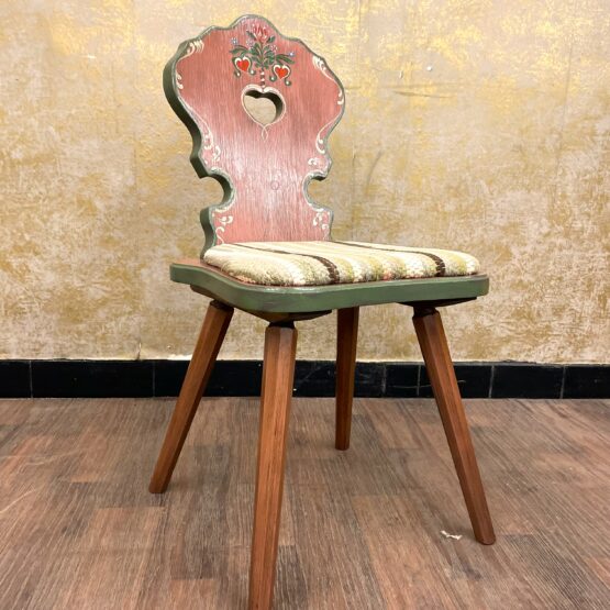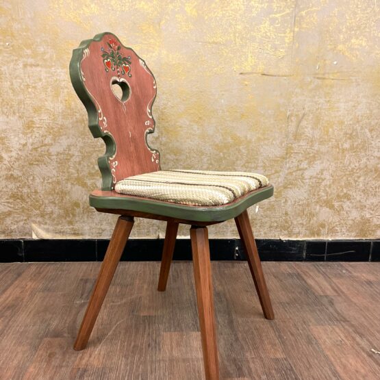 Mit seinem herzförmigen Rückenausschnitt und den liebevoll von Hand bemalten Blütenmotiven bringt dieser originale Voglauer Stuhl alpenländisches Flair in jeden Raum.
