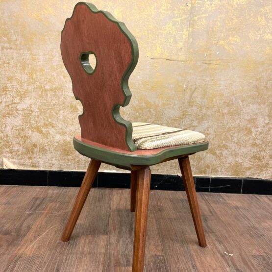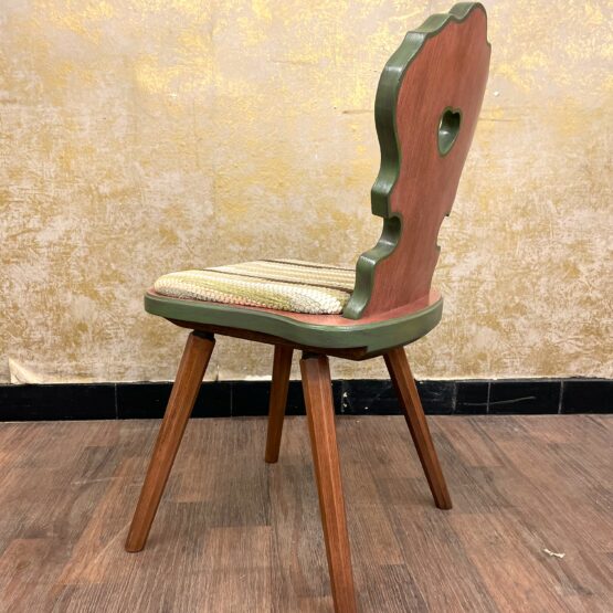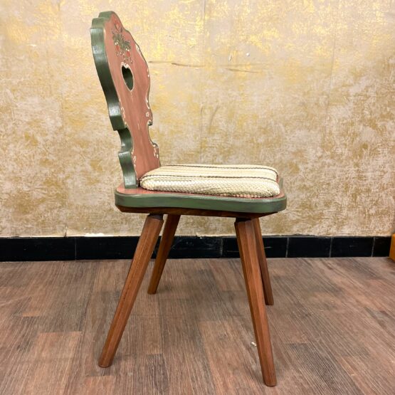 Die geschwungene Lehne, der grüne Rahmen und die warme Holzfarbe erzählen von echter Handwerkskunst – geschaffen, um Generationen zu überdauern. Die gepolsterte Sitzfläche sorgt für angenehmen Komfort, ob in der Wohnküche, am Esstisch oder in der gemütlichen Stube.