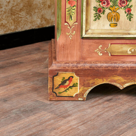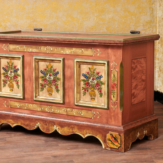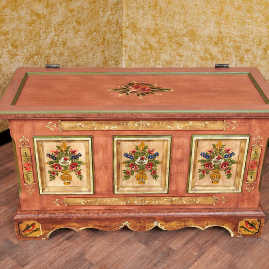 Die aufwendige Handbemalung mit floralen Motiven verleiht dem Möbelstück seinen einzigartigen Charme. Drei reich verzierte Paneele mit farbenfrohen Blumensträußen setzen eindrucksvolle Akzente und machen die Truhe zu einem echten Blickfang. Das warme Altrosa harmoniert dabei wunderbar mit goldenen und grünen Details.
