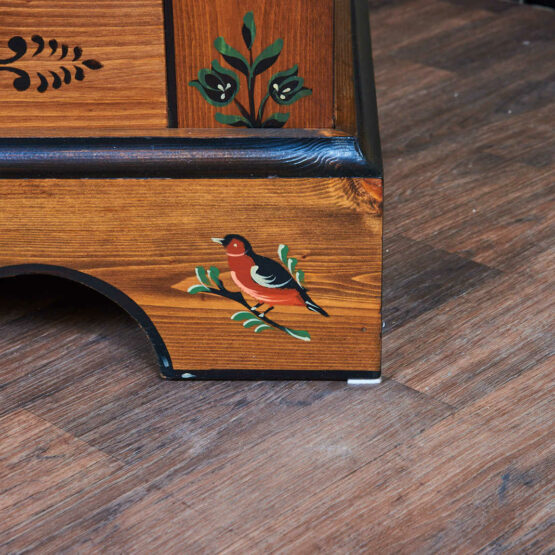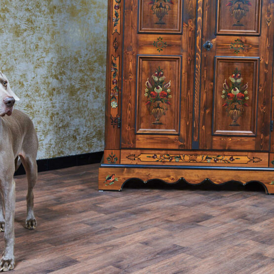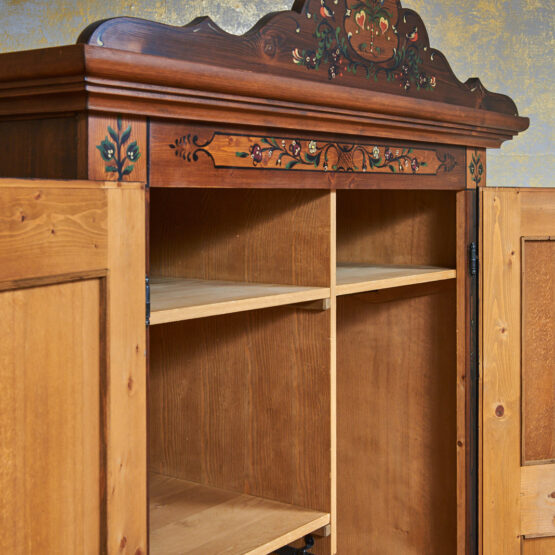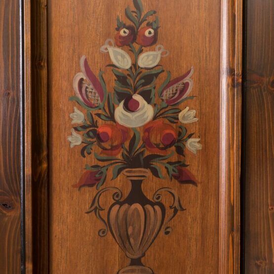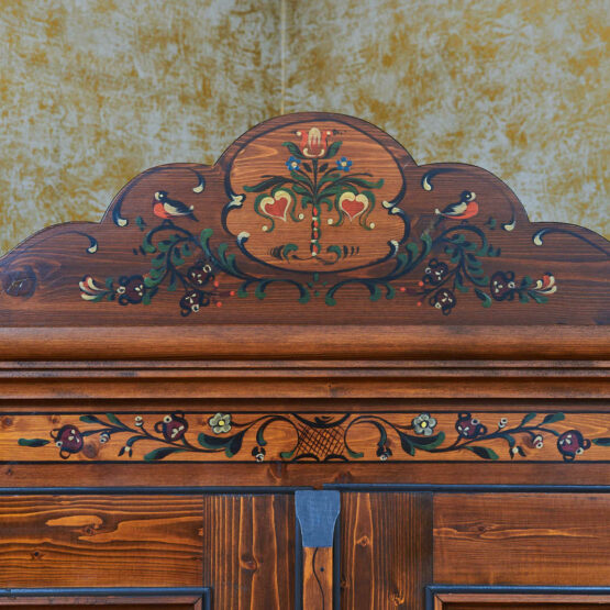 Ein wunderschöner Bauernschrank von Voglauer aus der Serie „Anno 1800“. Die warme Braunfärbung in Kombination mit der kunstvollen Bauernmalerei verleiht ihm einen ganz besonderen Charme.