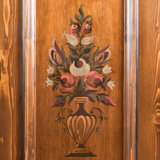 Das massive Fichtenholz wurde mit viel Liebe zum Detail verarbeitet und sorgt für eine langlebige Qualität. Auf Wunsch lässt sich der Zieraufsatz abnehmen, wodurch der Schrank eine Höhe von 182 cm erreicht und einen geraden, schlichten Abschluss erhält – perfekt für unterschiedliche Raumhöhen und Einrichtungsstile.