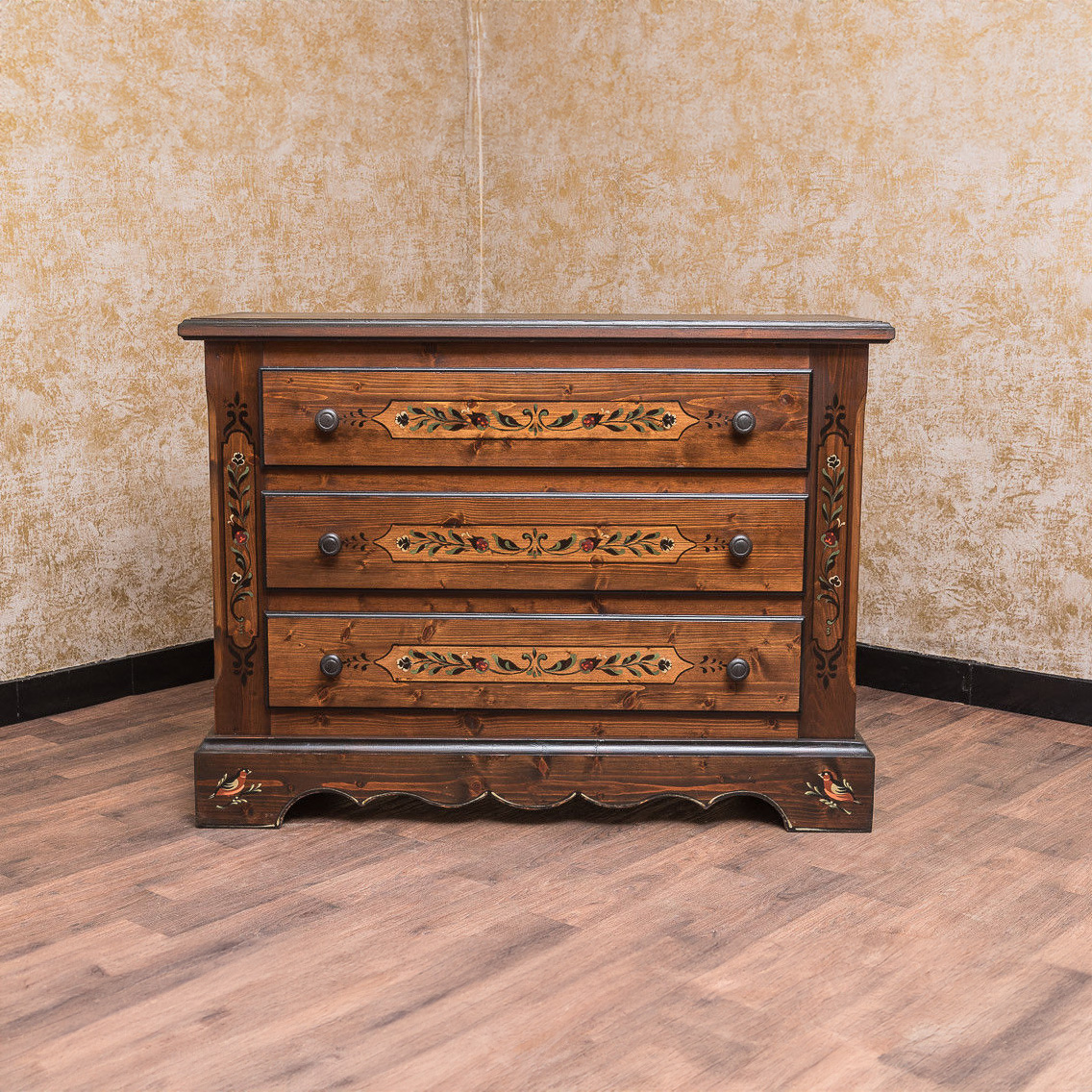 Gefertigt aus massivem Fichtenholz und in einem warmen Braunton gehalten, beeindruckt sie durch die feinen, von Hand gemalten Verzierungen. Die drei geräumigen Schubladen bieten reichlich Stauraum für Kleidung, Wäsche oder andere persönliche Dinge und lassen sich dank der runden Knäufe bequem öffnen.