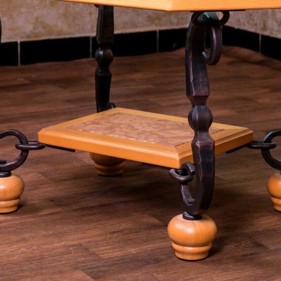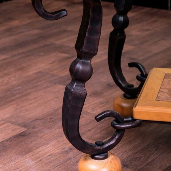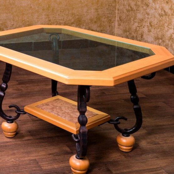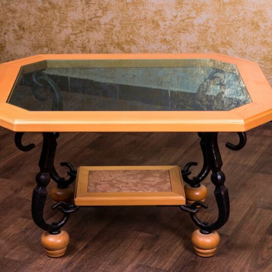 Die achteckige Glasplatte wird von einem stabilen Holzrahmen eingefasst, während die kunstvoll geschwungenen Metallbeine mit den runden Holzfüßen dem Tisch einen besonderen Charakter verleihen.
