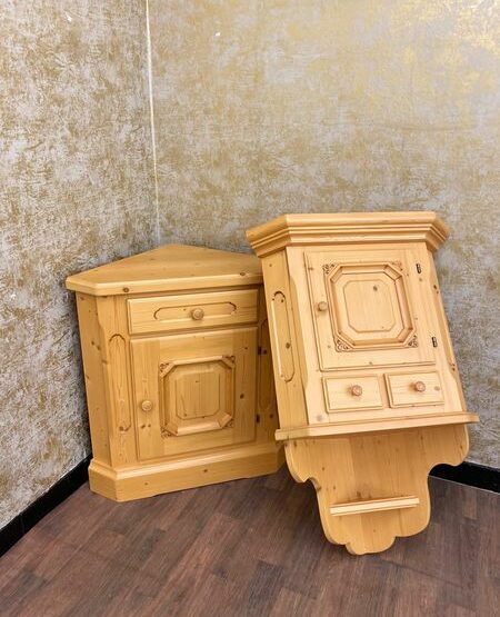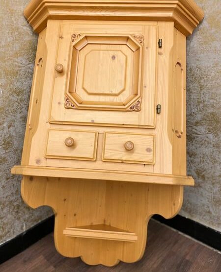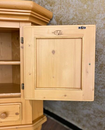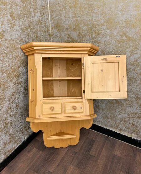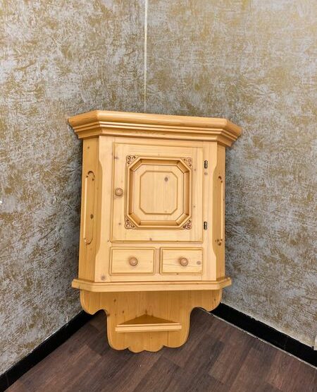 Ein echter Klassiker für die Wand: Dieser originale Voglauer Hängeschrank im warmen Goldton wurde speziell für die Eckmontage gefertigt – ein funktionaler Blickfang mit traditioneller Seele.