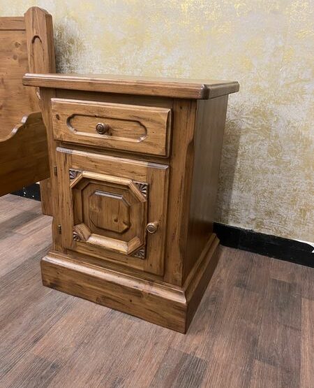 Das dunkle Fichtenholz verleiht ihm eine warme, gemütliche Note – ideal für ein Schlafzimmer mit ländlichem Charakter. Eine Schublade und ein kleines Schrankfach sorgen für praktischen Stauraum direkt am Bett. Ob für Bücher, Wecker oder persönliche Kleinigkeiten – hier ist alles gut verstaut.