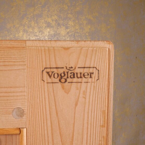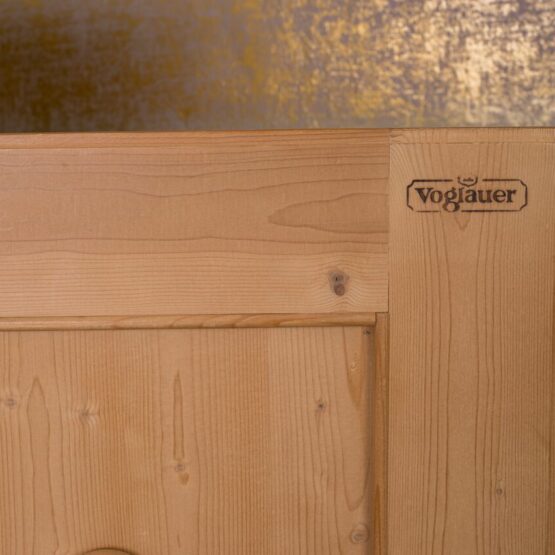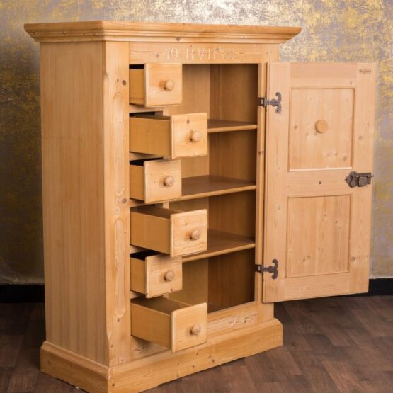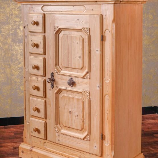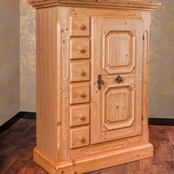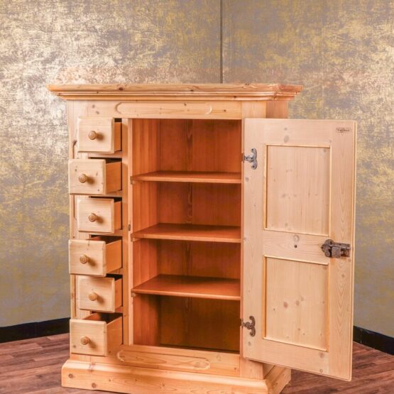 Gefertigt aus massivem, hell geöltem Fichtenholz, bietet das Möbelstück sieben seitlich angeordnete Schubladen – ideal für Kleinutensilien, Textilien oder Haushaltszubehör. Rechts sorgt ein geräumiges Schrankfach mit Einlegeboden für zusätzlichen Stauraum.