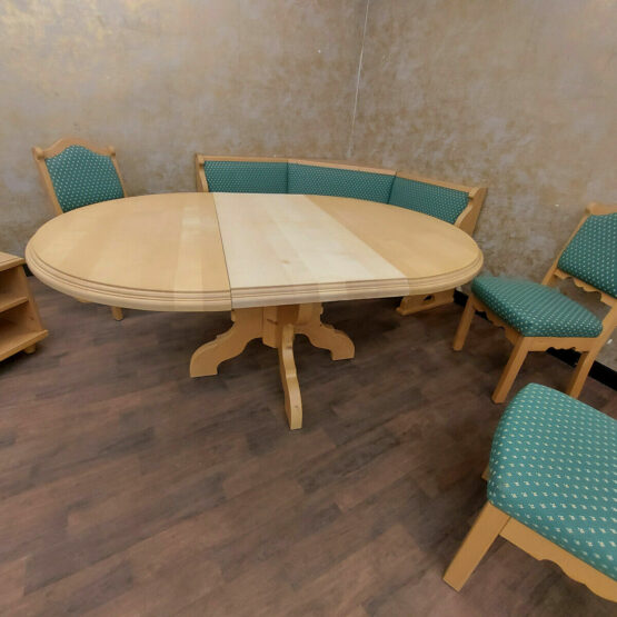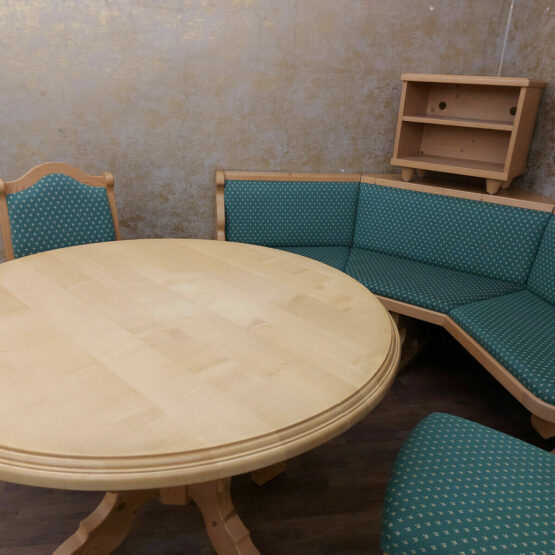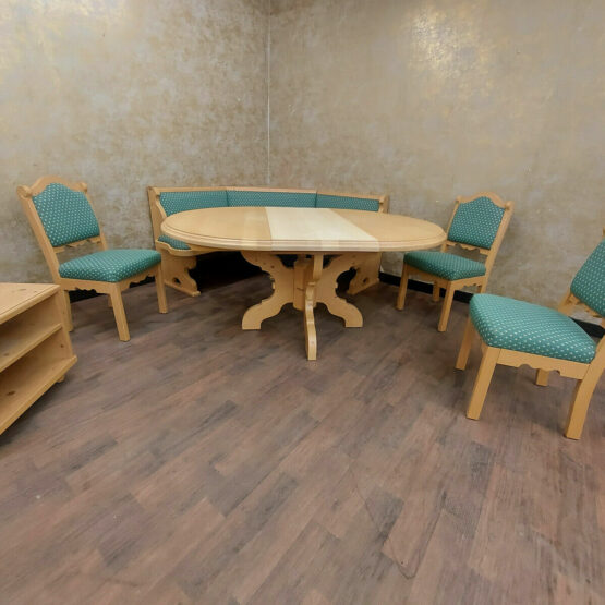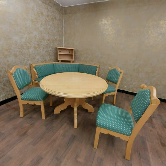 Es handelt sich bei dieser Essgarnitur, bestehend aus Eckbank (Segmentbank), Tisch und 3 Stühlen um sehr exquisite Stücke von höchster Qualität.