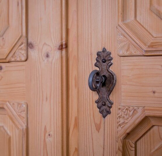 Klassische Beschläge und die schöne Holzmaserung machen diesen Schrank zu einem echten Lieblingsstück.