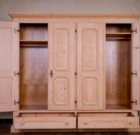 Dieser viertürige Kleiderschrank aus der Serie „Anno 1900“ bietet jede Menge Platz und bringt mit seinem hellen, naturbelassenen Fichtenholz ein Stück ländliche Gemütlichkeit ins Zuhause.