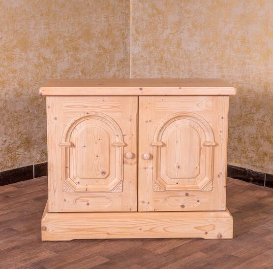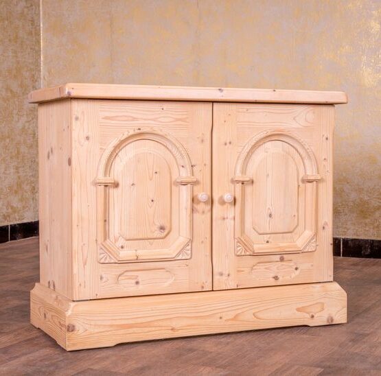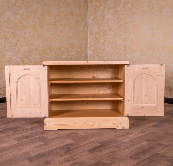 Gefertigt aus massivem, hellen Fichtenholz, beeindruckt sie mit ihrer warmen, natürlichen Ausstrahlung und den aufwendig profilierten Türfüllungen in klassischem Landhausstil. Hinter den beiden Flügeltüren verbergen sich zwei Einlegeböden, die großzügigen Stauraum für Geschirr, Wäsche oder andere Alltagsgegenstände bieten.