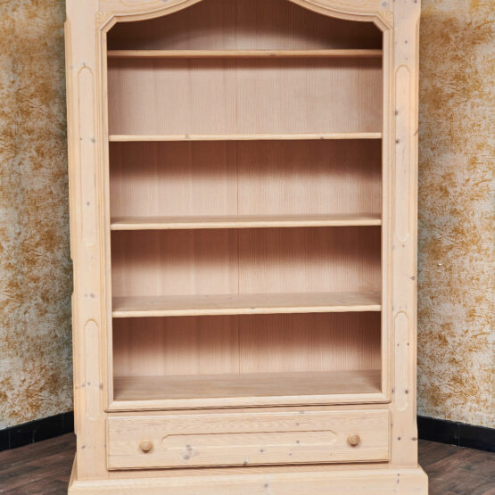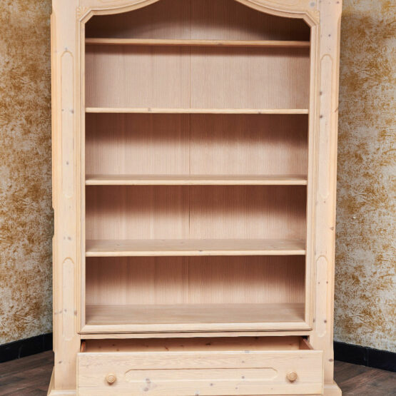 Fünf offene Regalböden bieten reichlich Platz für Bücher, Geschirr oder liebevoll arrangierte Dekorationen. Die geschwungene Krone verleiht dem Möbelstück eine klassische Note, während eine breite Schublade im unteren Bereich zusätzlichen Stauraum für Kleinigkeiten schafft.