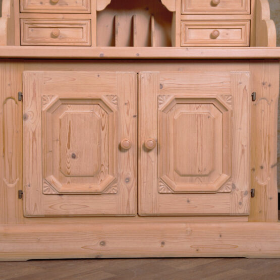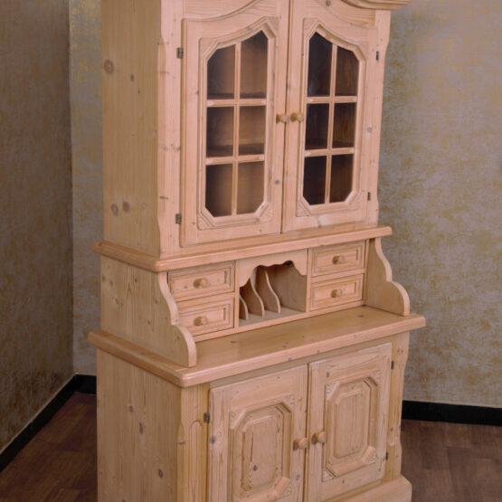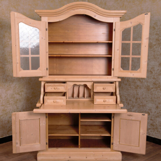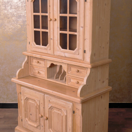 Die verglaste Vitrine krönt das Möbelstück und bietet auf zwei Einlegeböden stilvollen Platz für Dekoratives oder Wertvolles. Ein Sekretär, der Ordnung, Funktionalität und ländlichen Charme harmonisch vereint.
