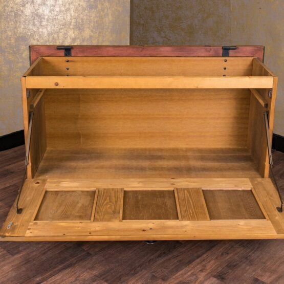 Diese Bauerntruhe lässt sich von vorne sowie von oben öffnen. Diese Kommode verfügt außerdem über keinerlei Einteilung und hat somit einen leeren Innenraum.