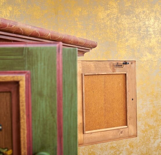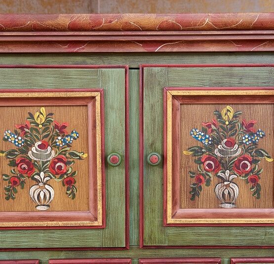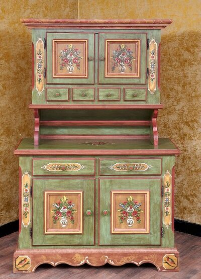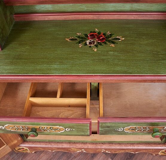 Die kunstvolle Bauernmalerei in harmonischen Farben macht den Schrank zu einem echten Blickfang. Dank seiner durchdachten Aufteilung mit zahlreichen Fächern und Schubladen finden all Ihre Dinge übersichtlich Platz. Ob im Esszimmer, in der Küche oder im Wohnbereich – dieser Buffetschrank fügt sich mühelos in verschiedenste Einrichtungen ein und sorgt für ein stilvolles Ambiente.