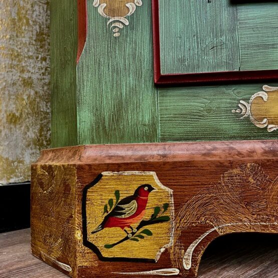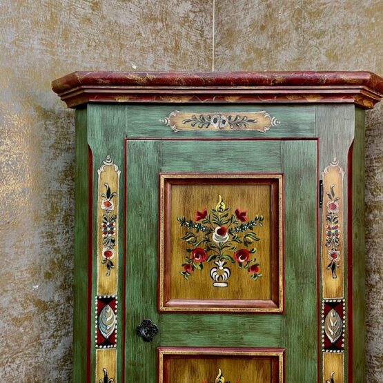 Dieser handbemalte Bauernschrank vereint traditionelle Handwerkskunst mit praktischer Funktionalität. Das schöne Altgrün strahlt eine gewisse Eleganz aus, während die Bauart ländlichen Charme verbreitet. Insgesamt entsteht so ein gelungenes und harmonisches Gesamtbild.
